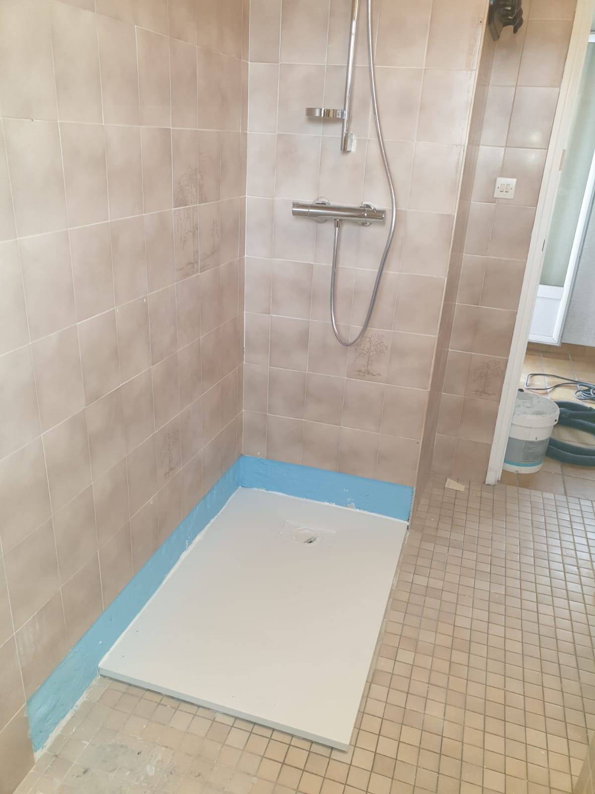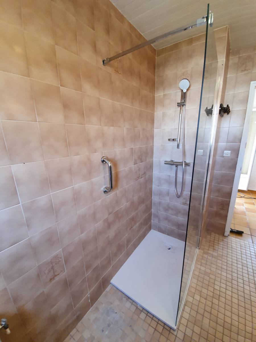 Simple petit bac de douche, glissant et dangereux, sans paroi ni de quoi se maintenir, nous sommes intervenus pour adapter et sécuriser la douche d'une personne âgée (fourniture comprise).