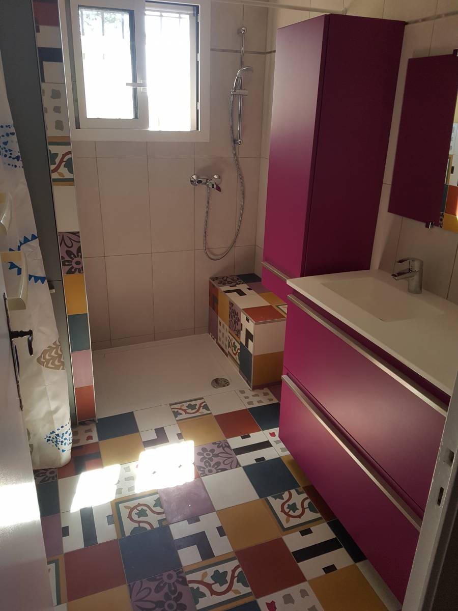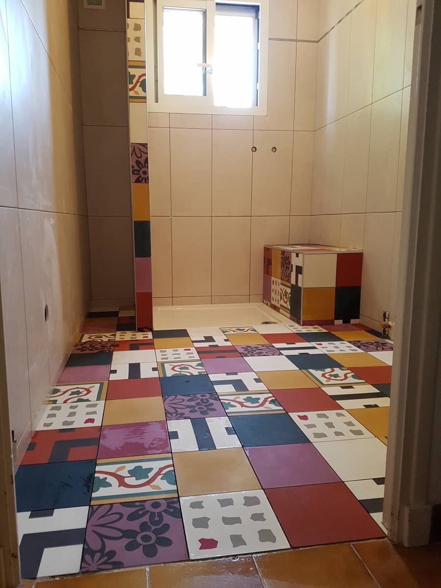 - revêtu le sol, la cloison et le banc de superbes carreaux de ciment décoratifs multicolores