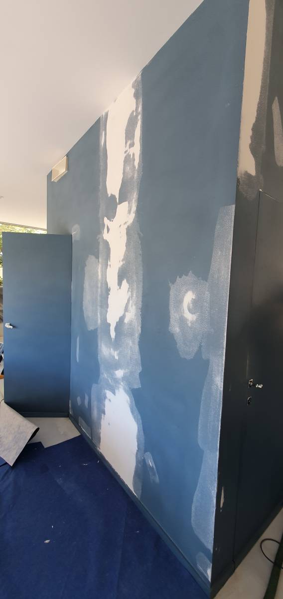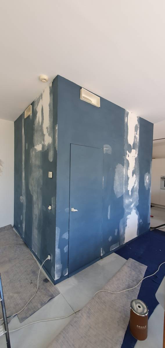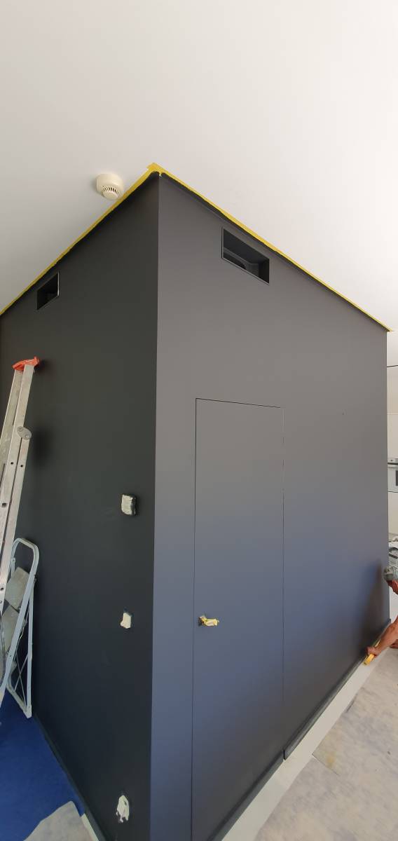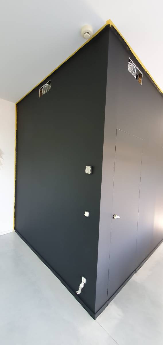 Protection des sols, préparation du support (enduit et ponçage), dépose des bouches de ventilation de la climatisation, puis mise en peinture noire des murs (fournie par nos clients), très surprenant, le résultat a vraiment fait, tout son effet !
