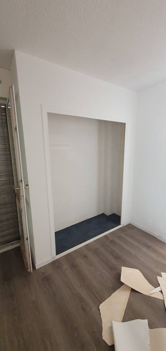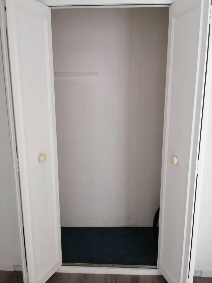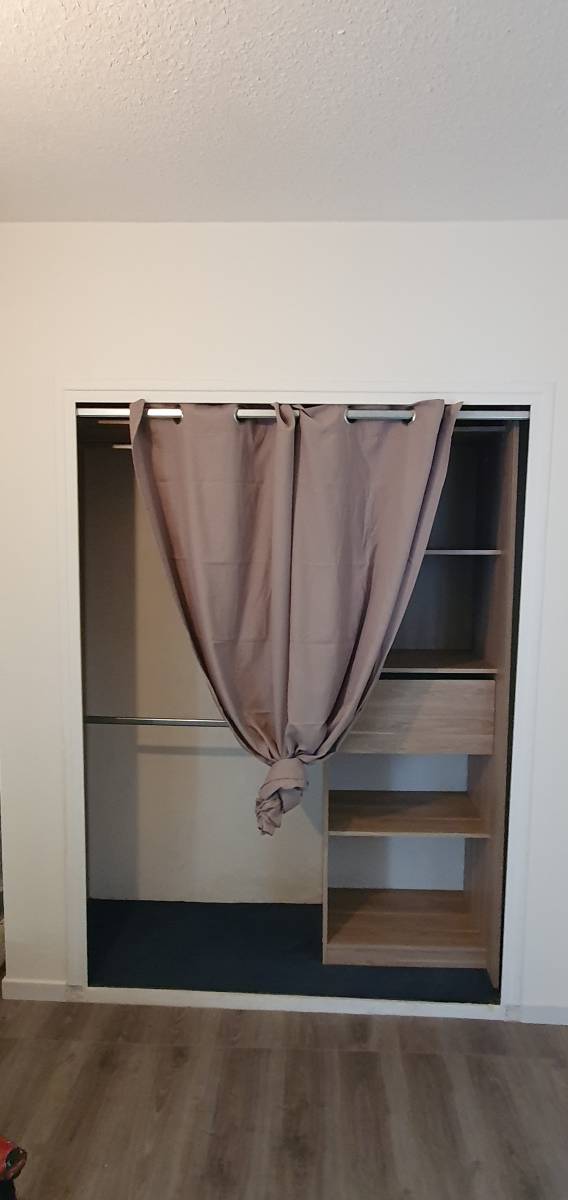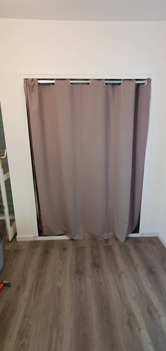 aménager le placard, nous avons tout d'abord démonté et mis à la décharge les portes coulissantes, afin de les remplacer par un joli rideau, bien plus pratique pour accéder à l'intérieur du placard. Pose d'une tringle extérieure nous avons