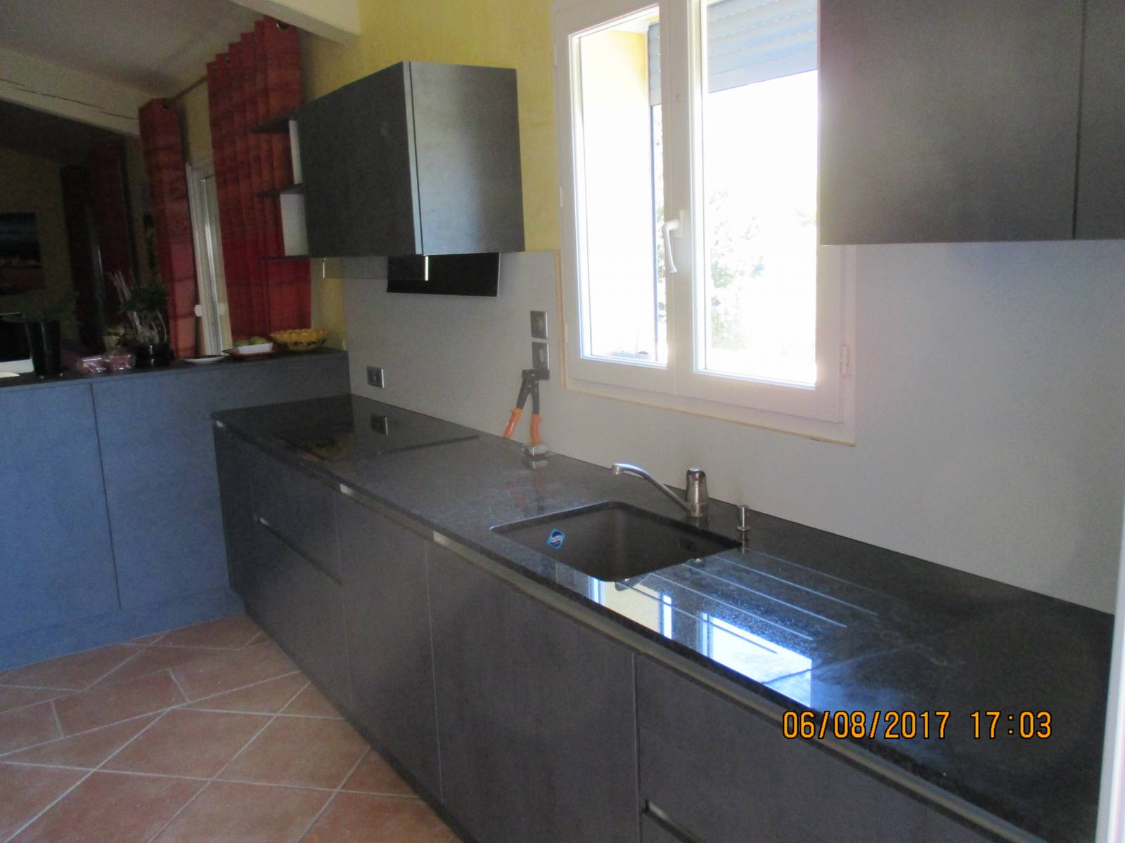 - Monté les meubles de cuisine, bas et hauts, le meuble rideau, plan de travail, évier et robinetterie