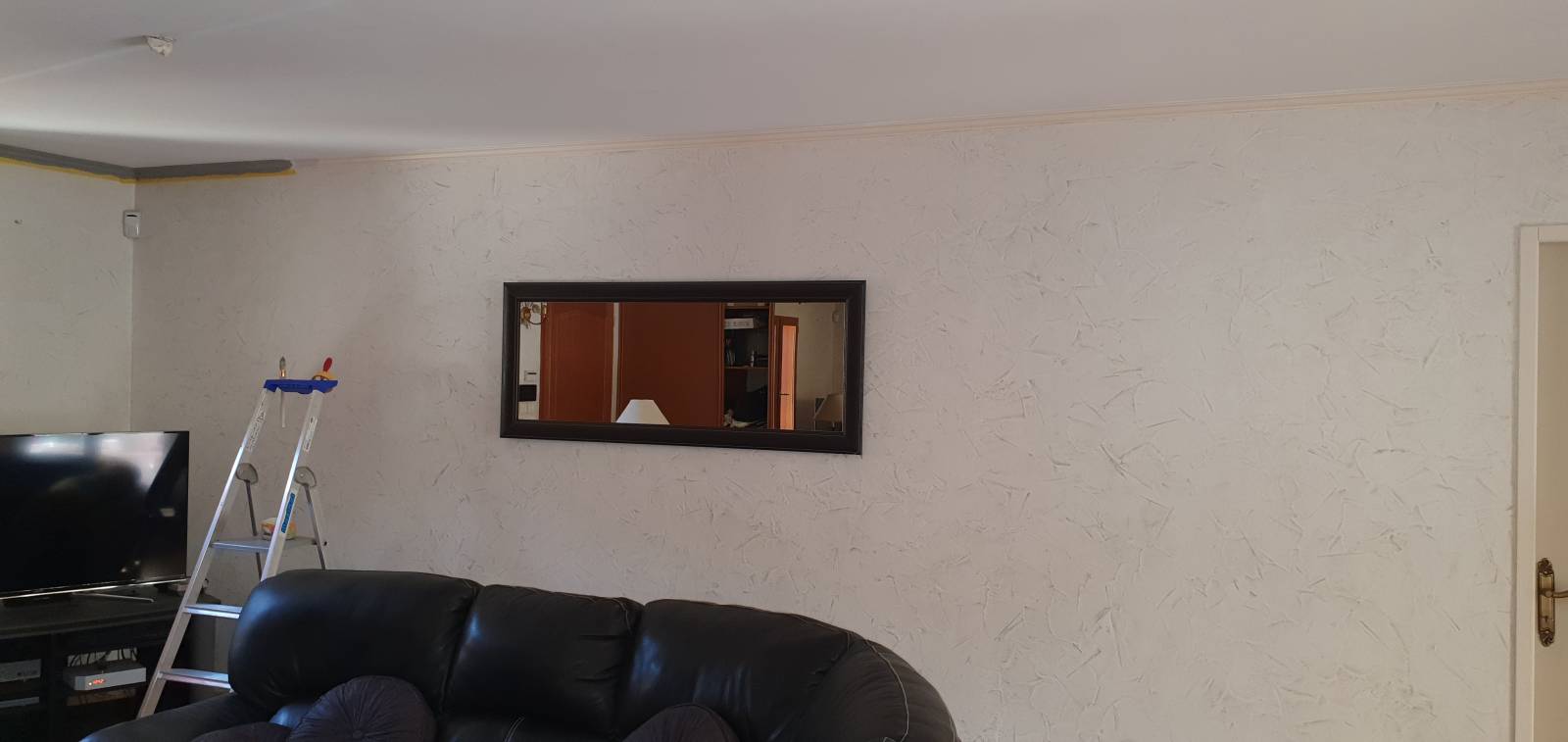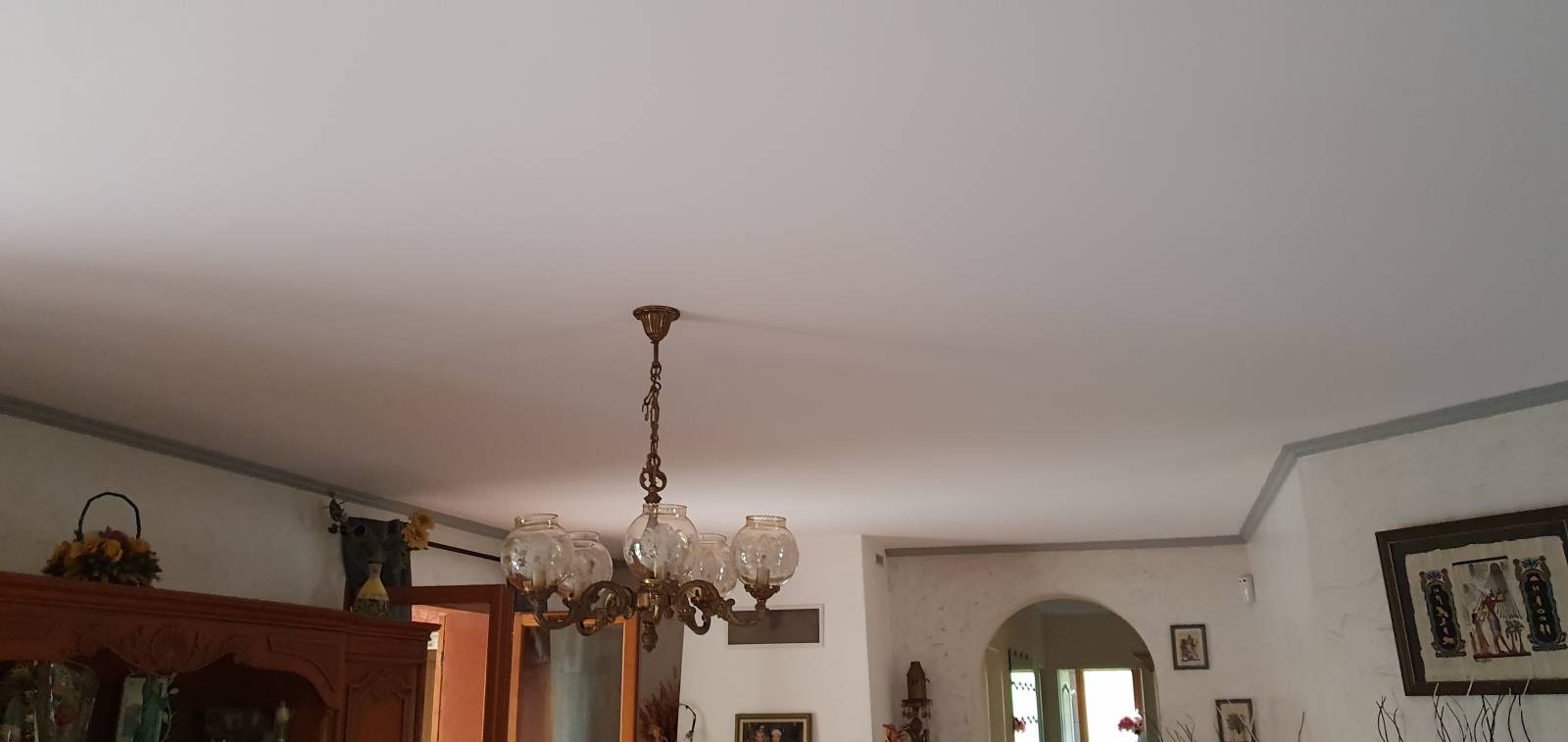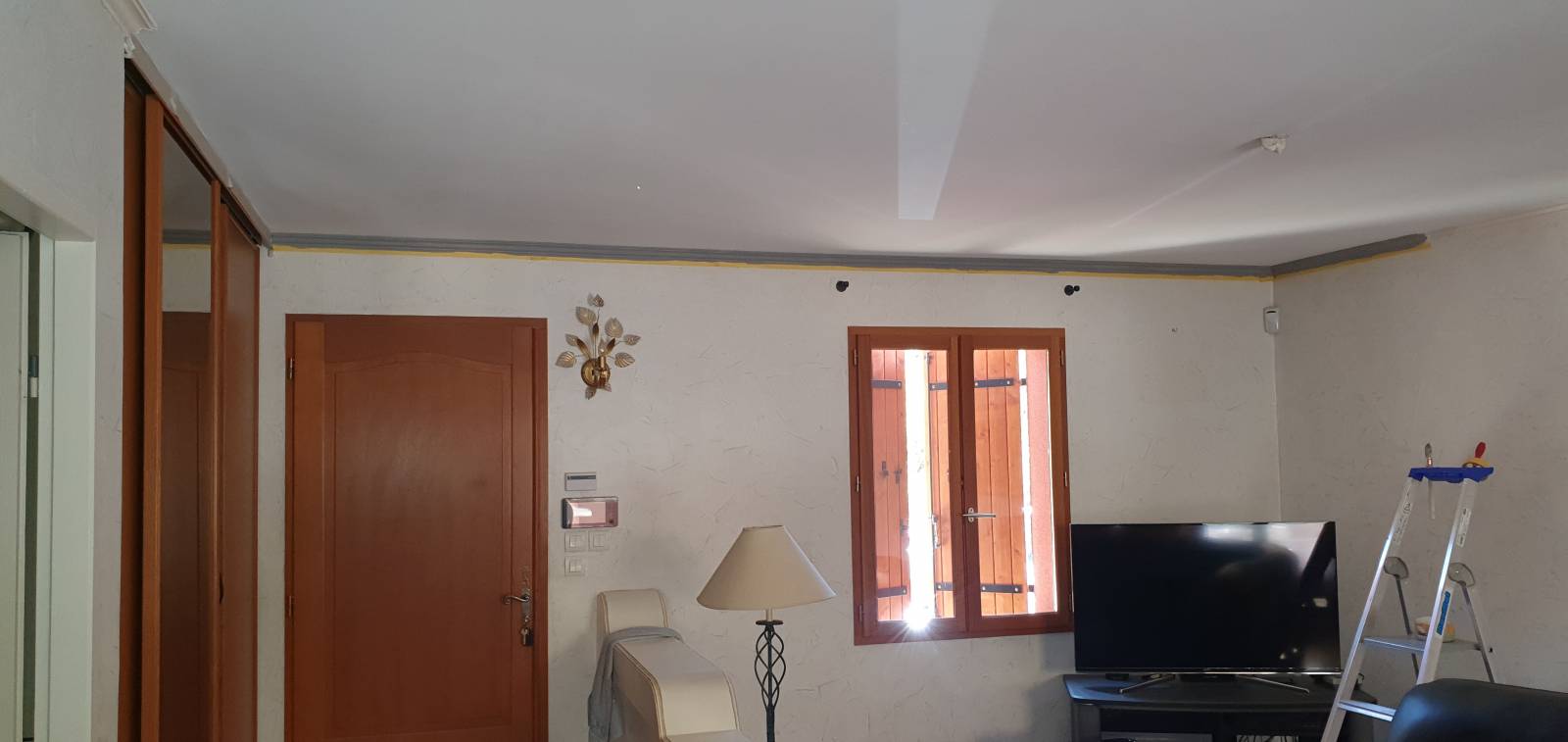 Rénovation du plafond et mise en peinture d'un blanc mat éclatant, petite touche déco, à la demande de nos clients, les corniches ont été repeintes en gris, rehaussant l'enduit mural existant.