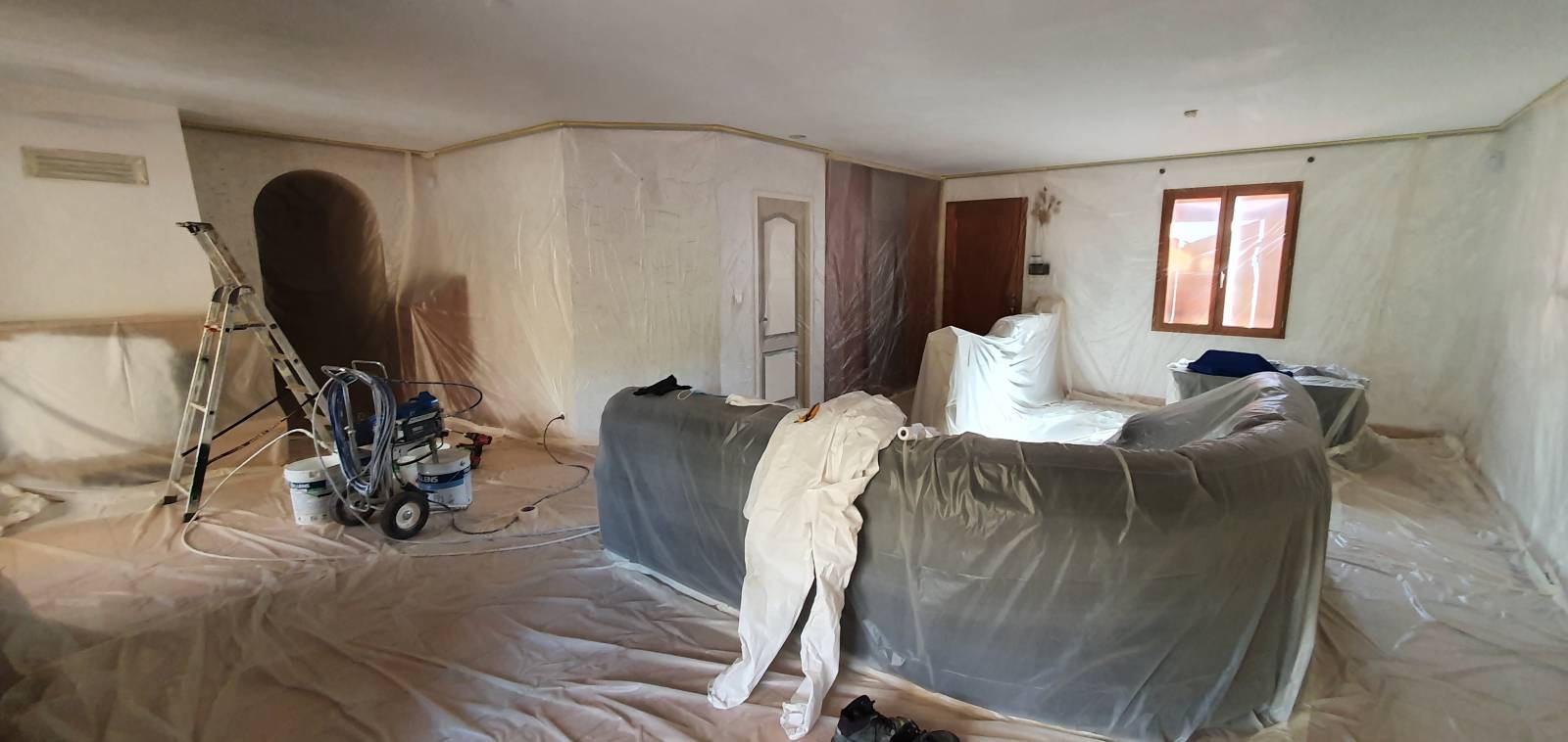 Peintres en bâtiment très professionnels, une fois la pièce vidée, nous avons commencé par un gros travail de préparation : sol, mur, porte, cheminée et mobilier restant, tout a été soigneusement été bâché. Une étape indispensable, puisque, compte tenu de la grande surface du