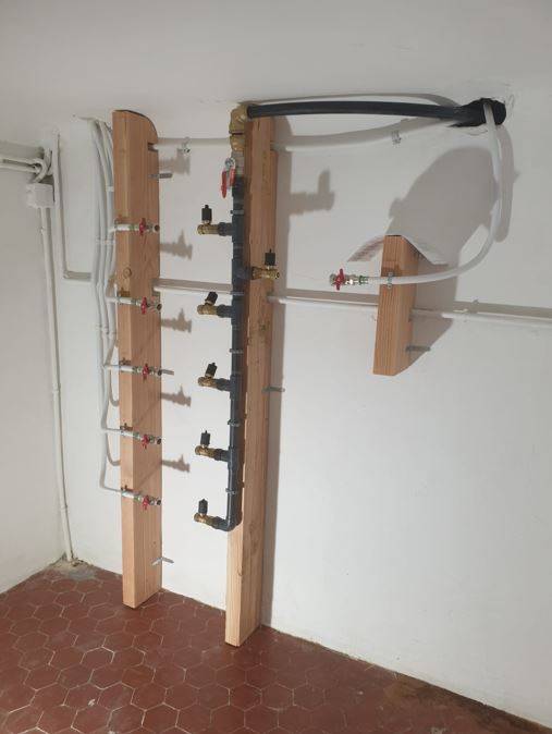 circuits d'eau : tuyauterie en PVC (pression de 16 bars), supports et nourrices de distribution