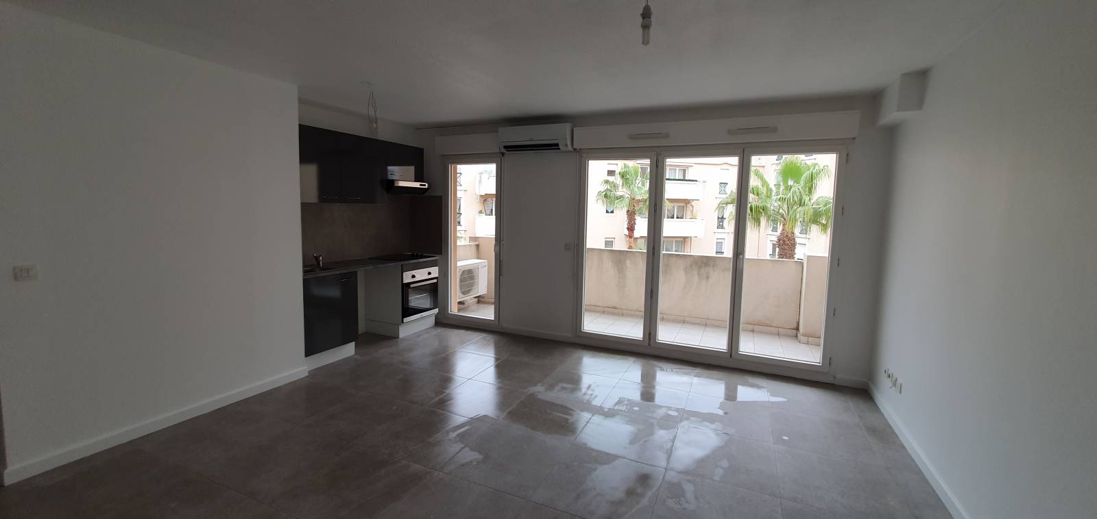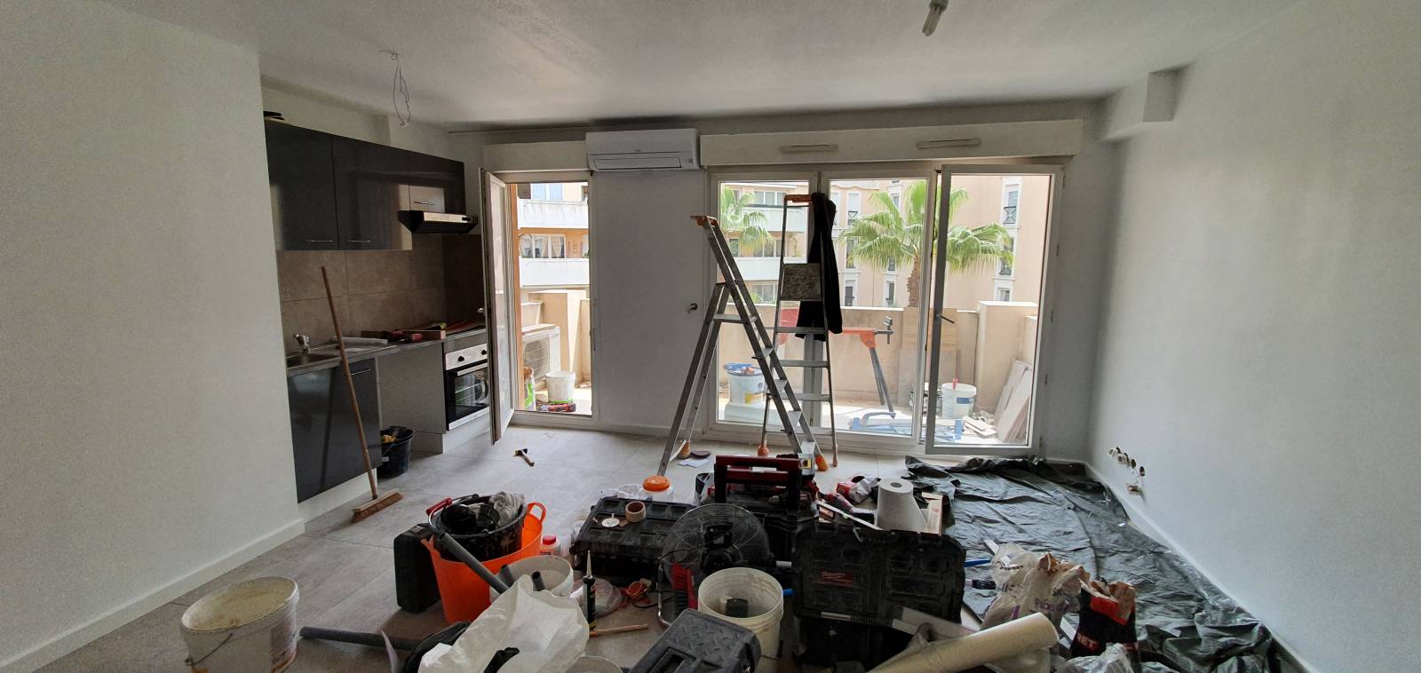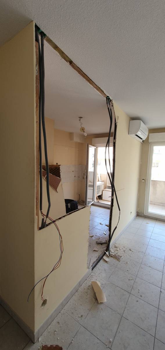 Rénovation d'un appartement à Hyères, pour agrandir l'espace et créer une cuisine ouverte sur le salon, nous avons cassé la cloison séparative, entraînant l'obligation de déplacer le split de la climatisation réversible, fixée sur ce mur.