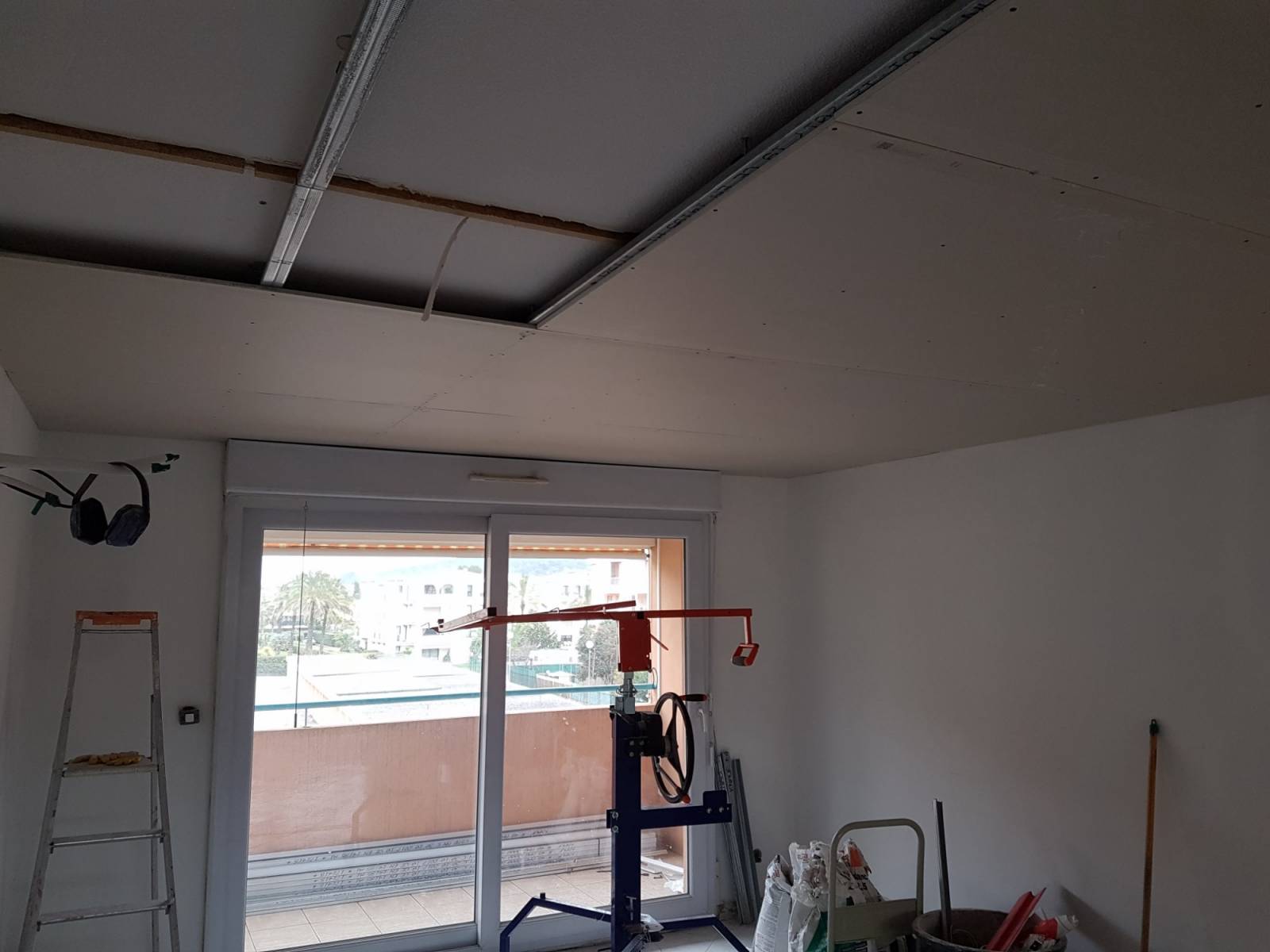 faux plafond et spots intégrés, a été réalisé à partir d'une ossature métallique et de rails, sertis et percés pour le passage des gaines électriques. Mise en place des spots, des plaques de plâtre, jointoiement et préparation du support (ponçage, égrenage, époussetage), la mise en peinture s'est faite d'une couche d'impression et de deux couches de peinture blanc mat.