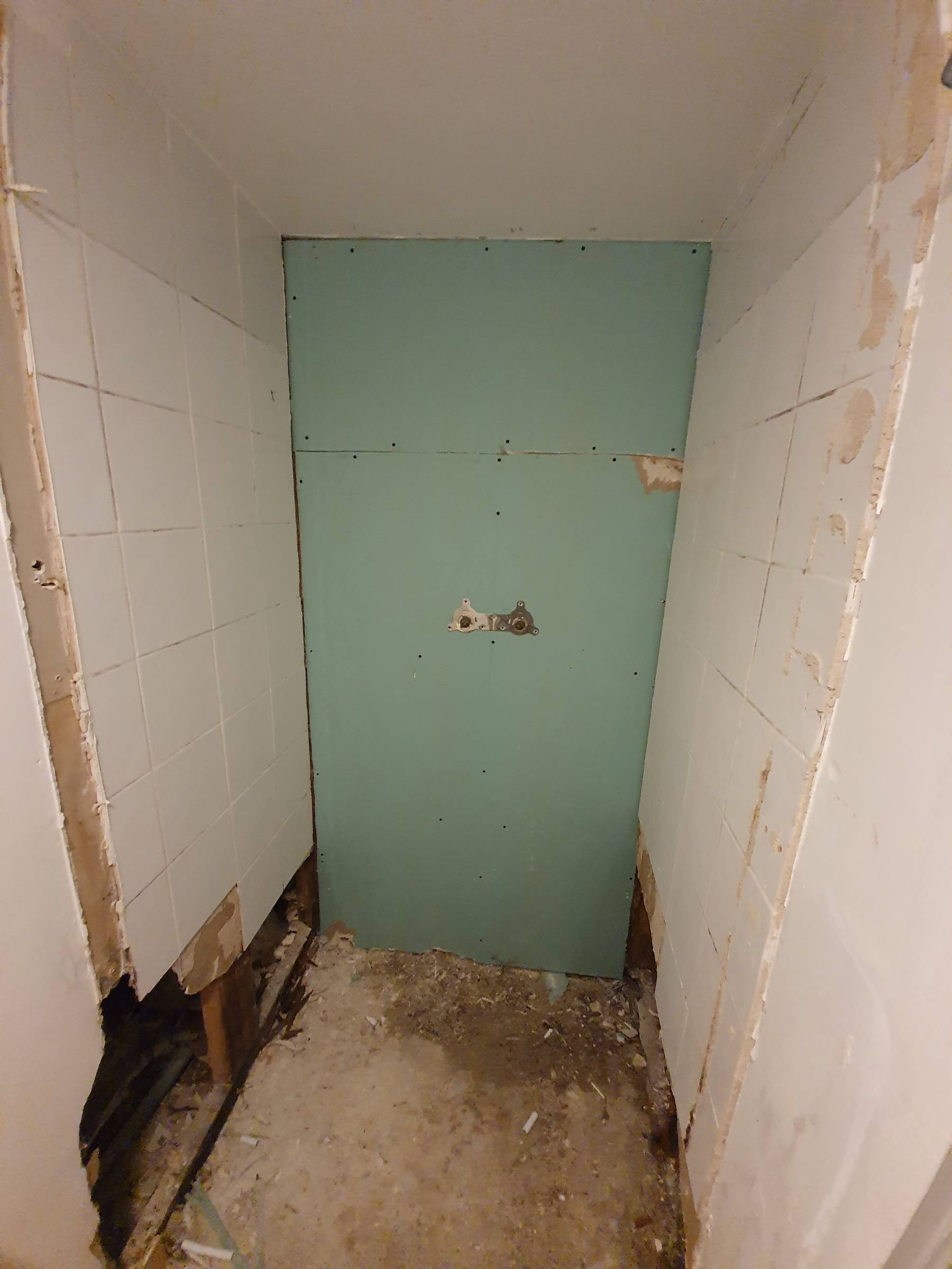 - Dépose et mise à la décharge de l'ancienne douche, de la faïence, des consignations électriques et de plomberie avant modifications ; la robinetterie étant mise de côté.