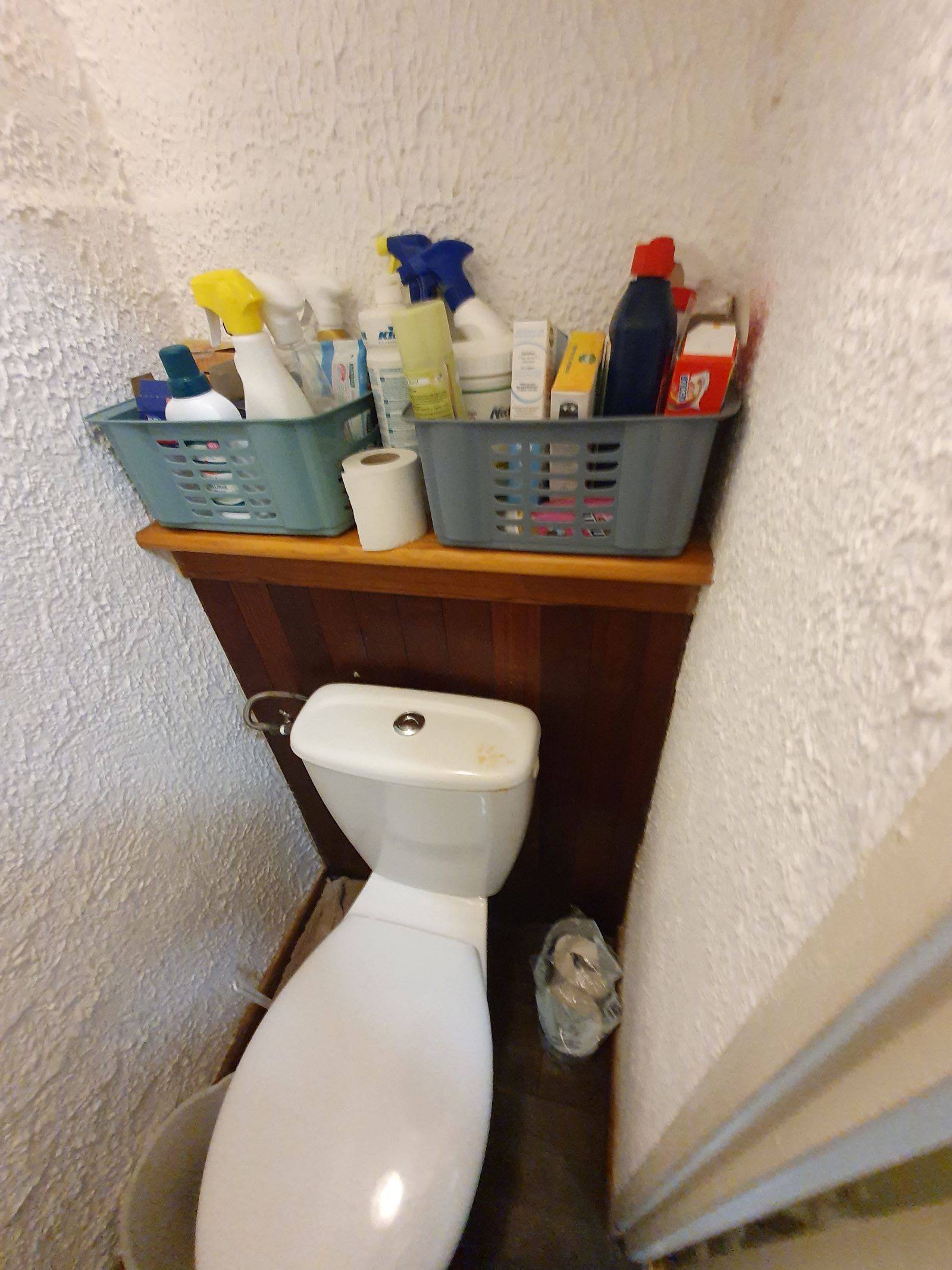 Ancien modèle de cuvette sur pied, sol vieux jeu et crépi sur les murs, totalement dépassés, vous avez pour projet de