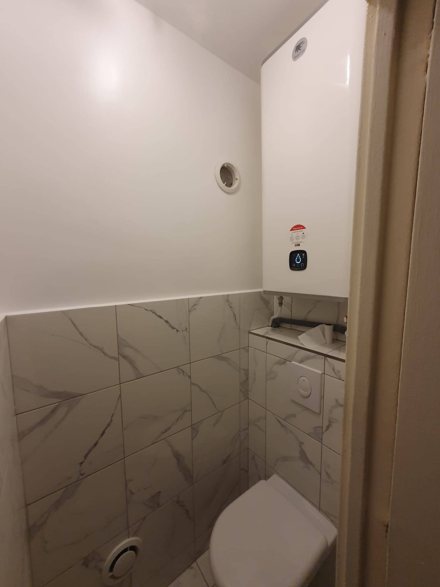 - Installation d'un chauffe-eau plat "Malicio 3 Thermor" multiposition 65 l blanc avec habillage et groupe sécurité / Reprise de l'alimentation des eaux