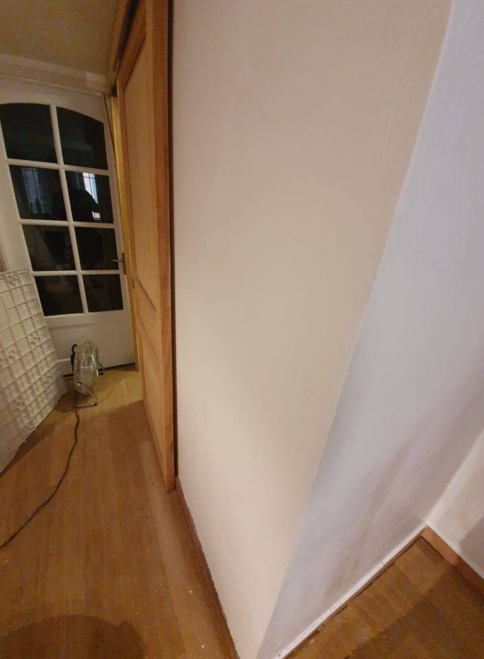- Mise en peinture du mur avec 1 couche d'impression et 2 couches de finition blanc velours