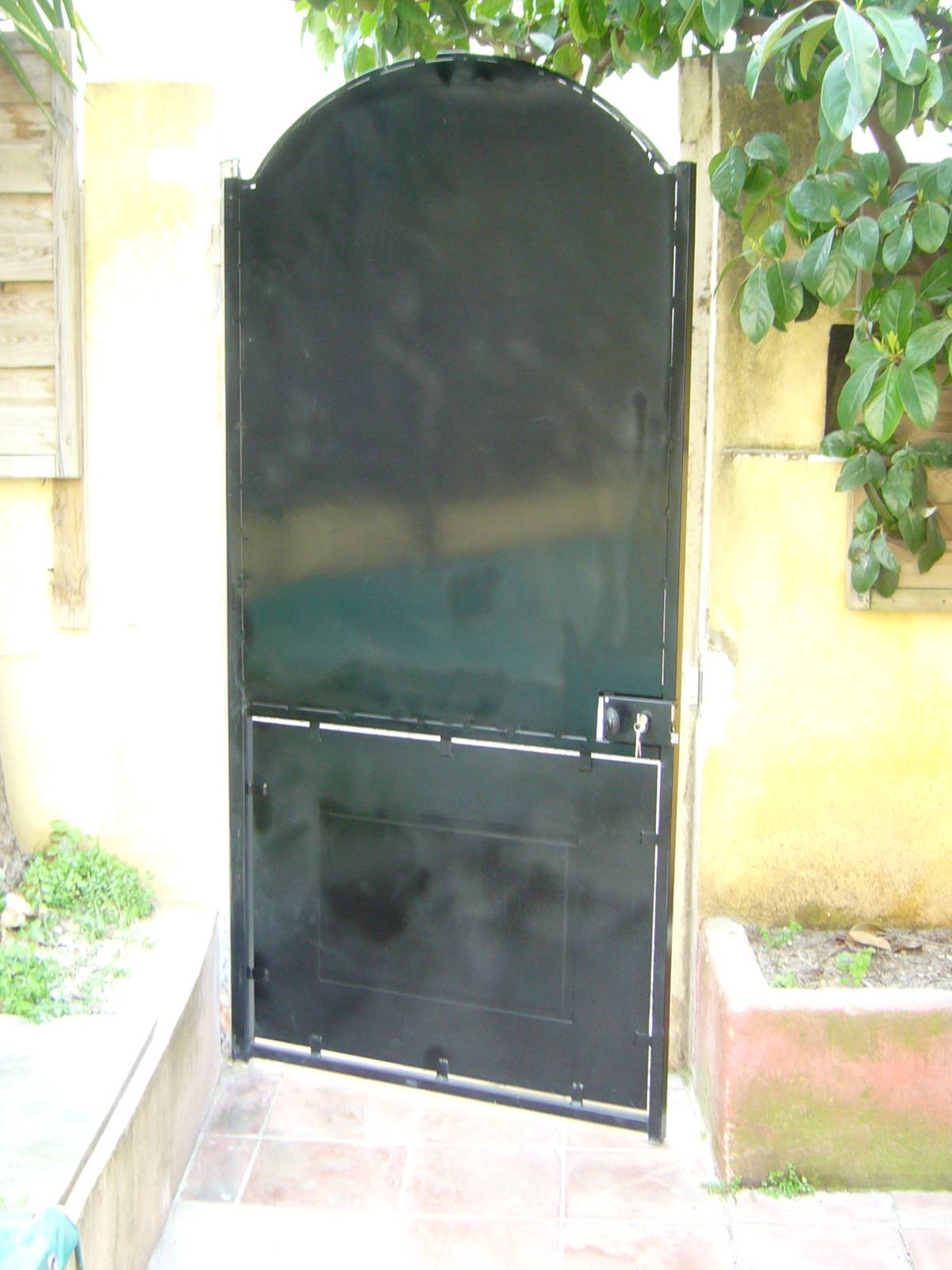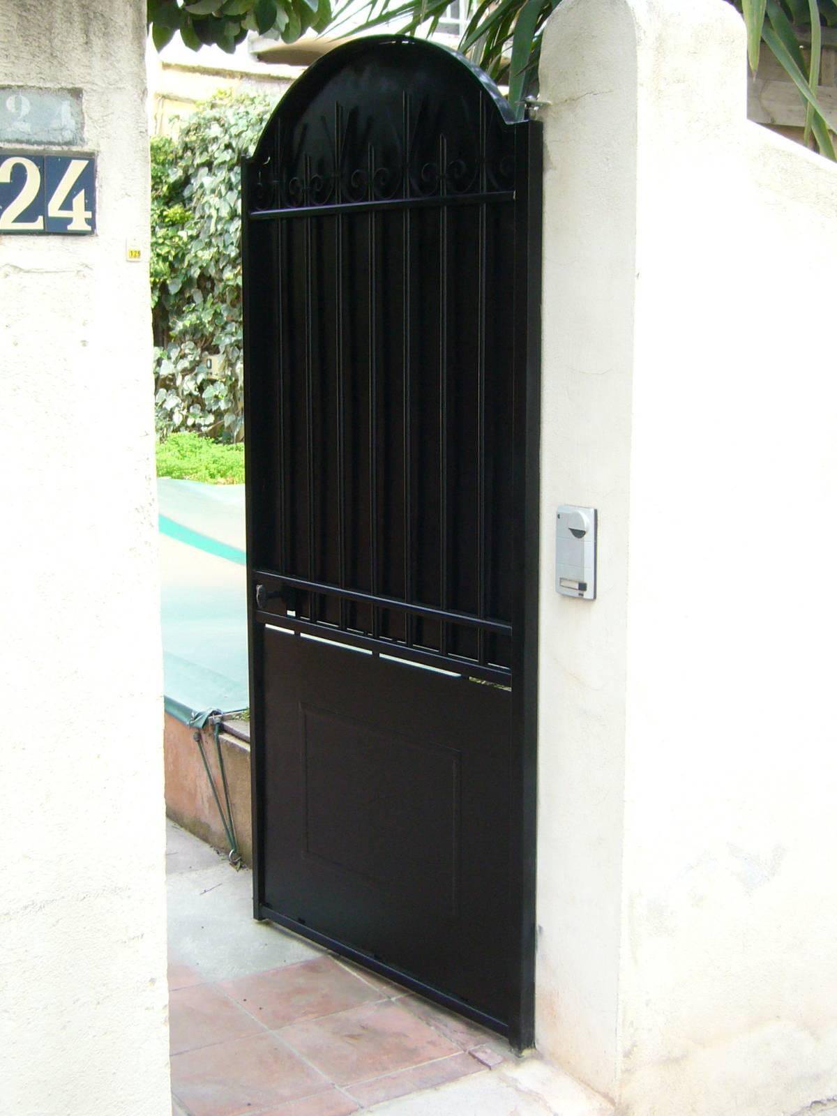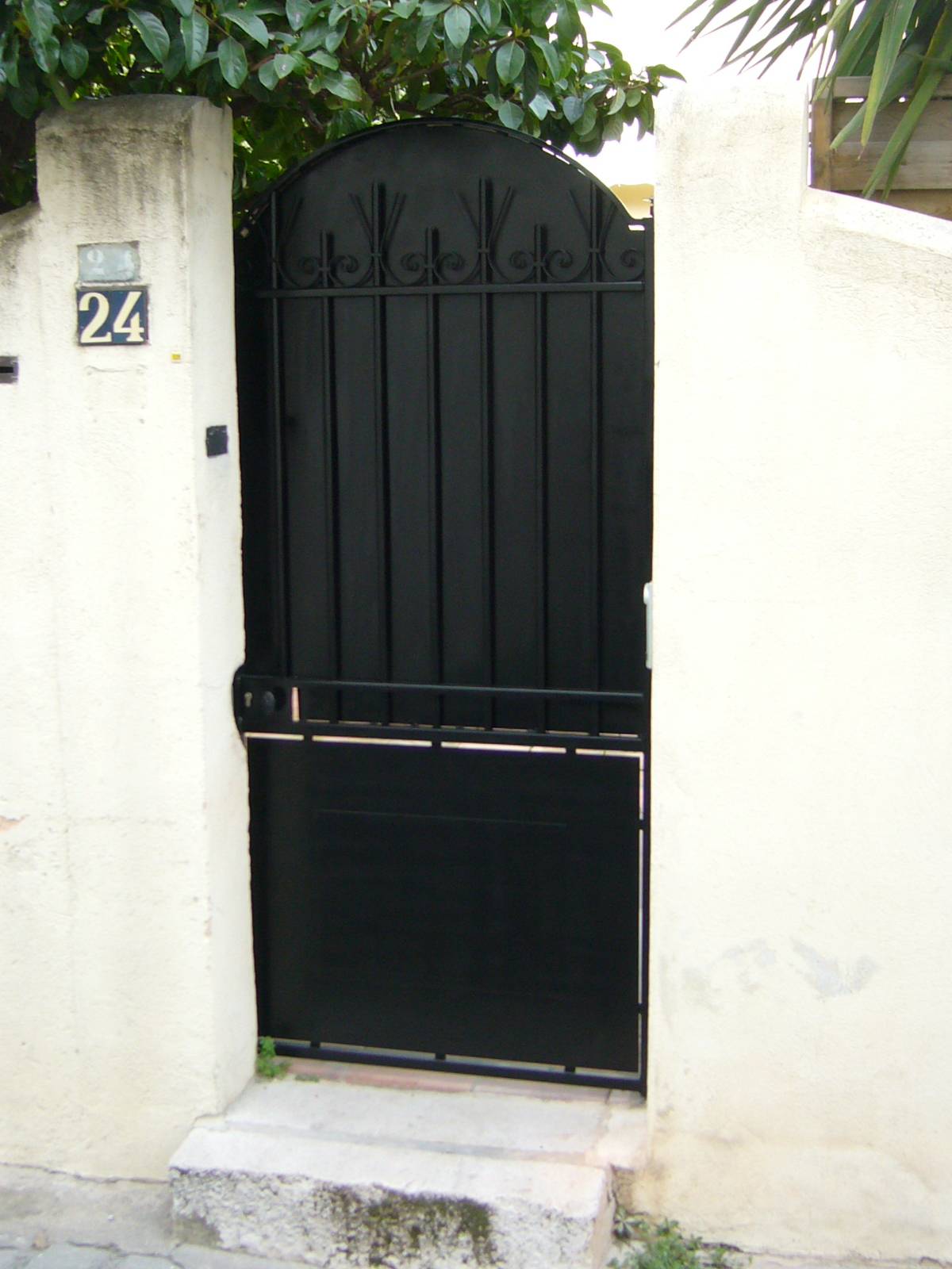 Ici, nous vous présentons un portillon en fer forgé rénové tant au niveau fermeture avec gâche et serrure électrique qu' avec le rajout d'un festonnage en tôle et d' un arceau de maintien le tout soudé par notre ferronnier et repeint de couleur noire après traitement de l'ensemble avec une peinture antirouille industrielle .