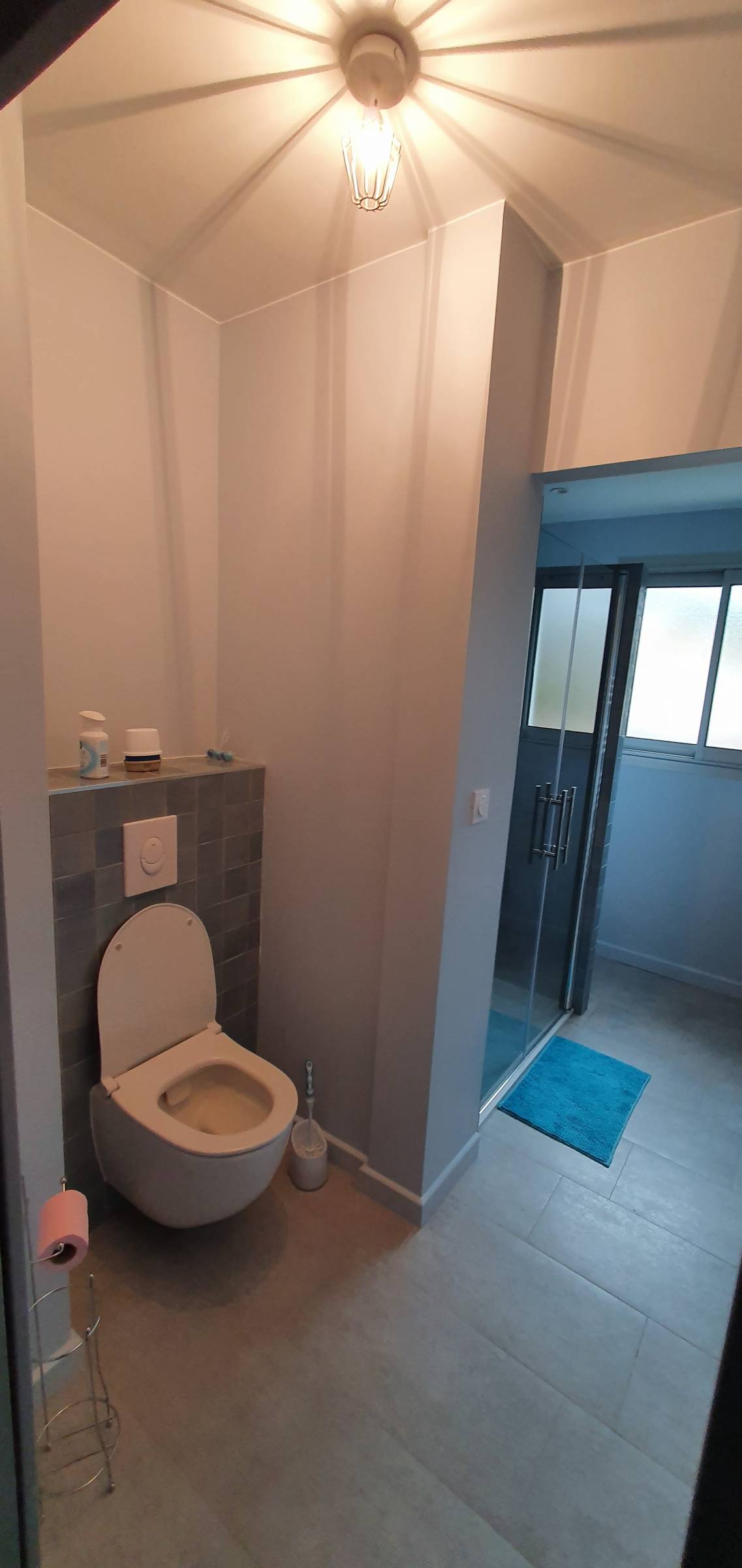 Pour permettre une ouverture aisée des portes vitrées de la nouvelle douche, le lavabo, situé en face, a été déplacé dans la continuité de celle-ci. Epuré et plus moderne, uniformisant l'ensemble, nous avons supprimé la porte, modifié et amélioré l'accès entre la salle de bain et le coin toilette.