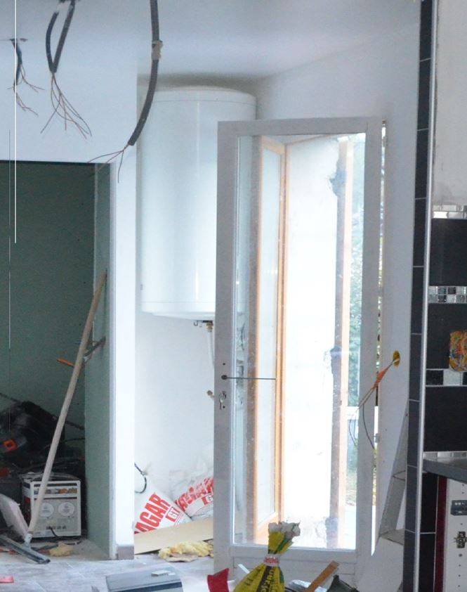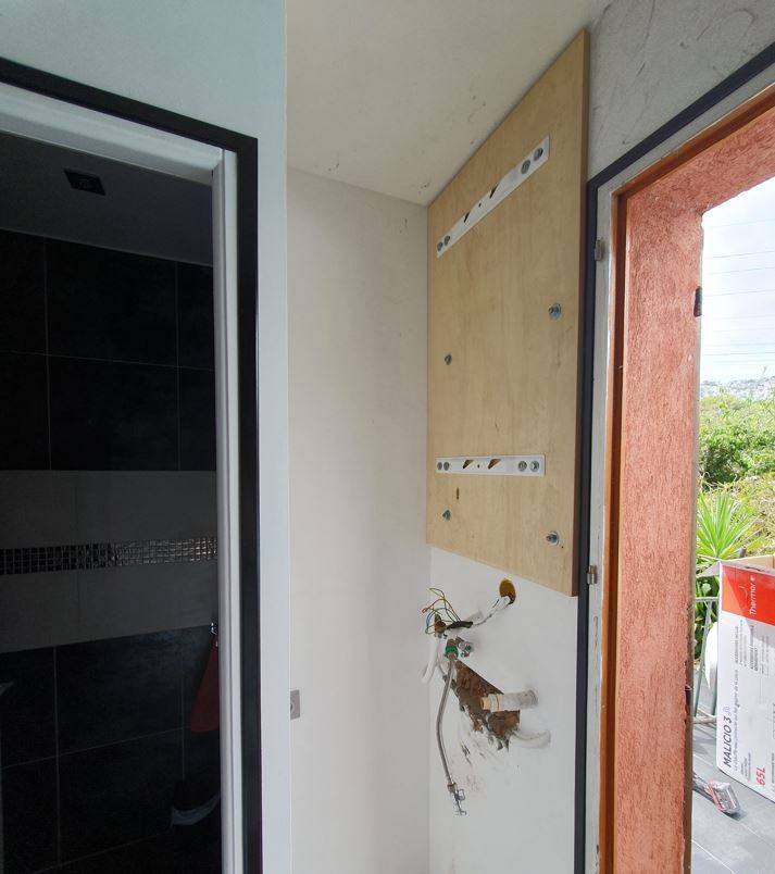 - Pose d'une plaque en bois pour fixer le cumulus et ses raccordements modifiés